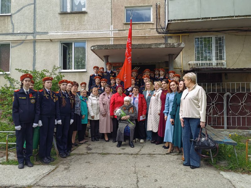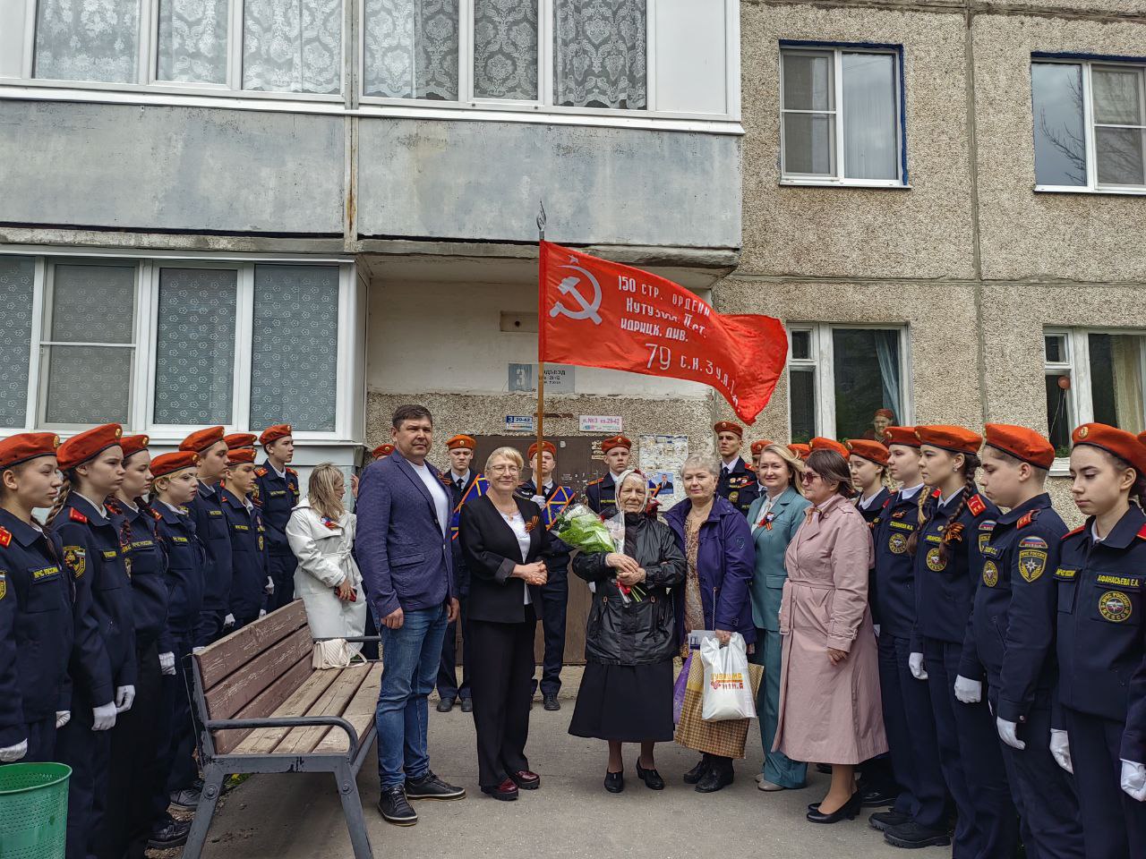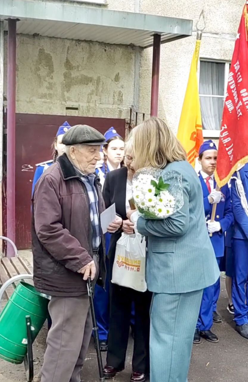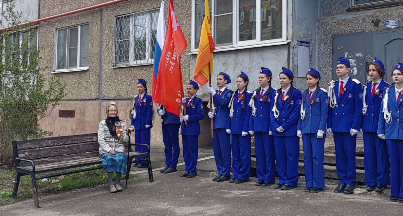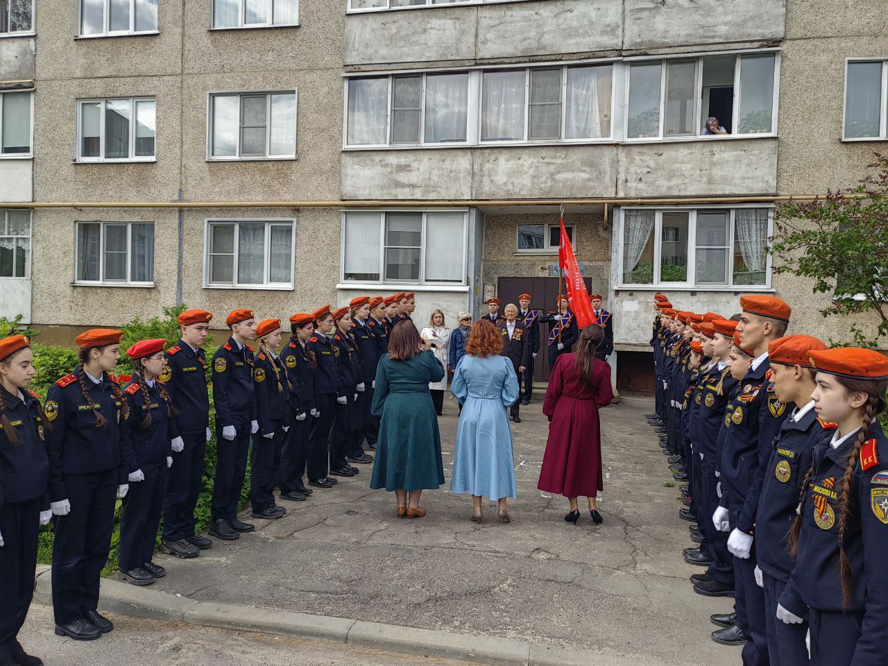 Сегодня уже провели пять "Парадов у дома". Кадеты школ города прошли строевым шагом перед ветеранами со знаменем и флагами.