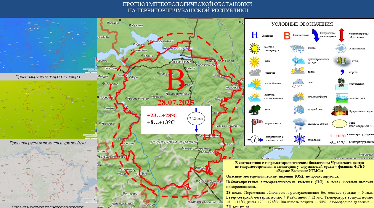 28 июля, по данным Чувашского центра по гидрометеорологии и мониторингу окружающей среды, жителей Чувашии ожидает переменная облачность, преимущественно без осадков. Ветер северной четверти, ночью - от слабого до сильного, днем подует сильный ветер.