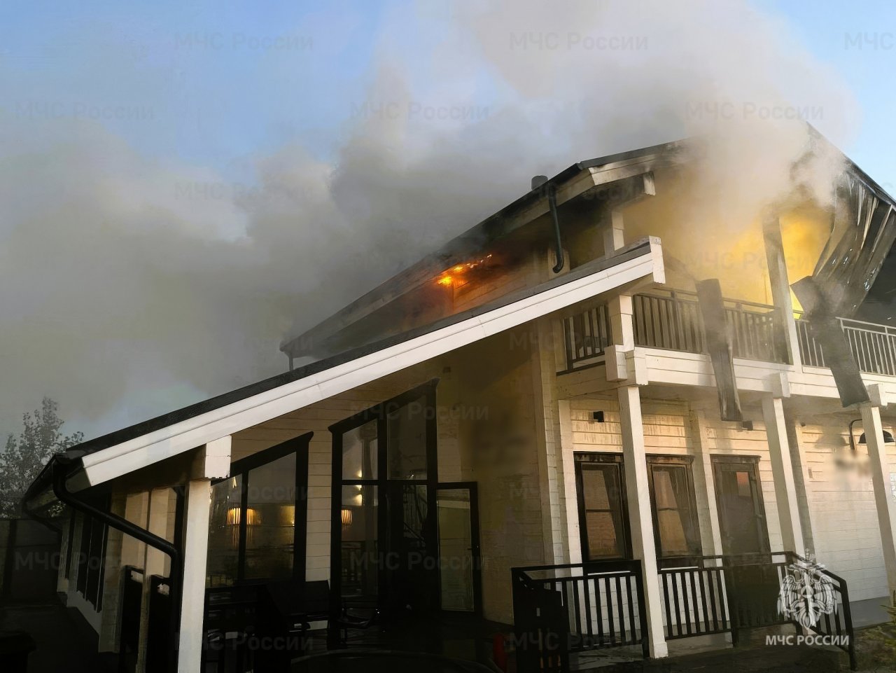 Более 20 пожарных и 8 МЧС машин прибыли на место пожара. Пожар потушили примерно за час, площадь возгорания составила около 100 квадратных метров. В результате повреждены крыша и помещения верхнего этажа. Жертв и пострадавших нет.