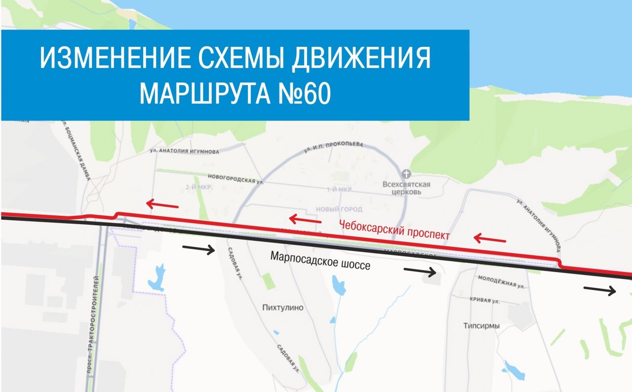 В настоящее время троллейбус №60 следует от Новочебоксарского химико-механического техникума до остановки "Университет" в Чебоксарах, проходя через деревни Типсирмы и Пихтулино.