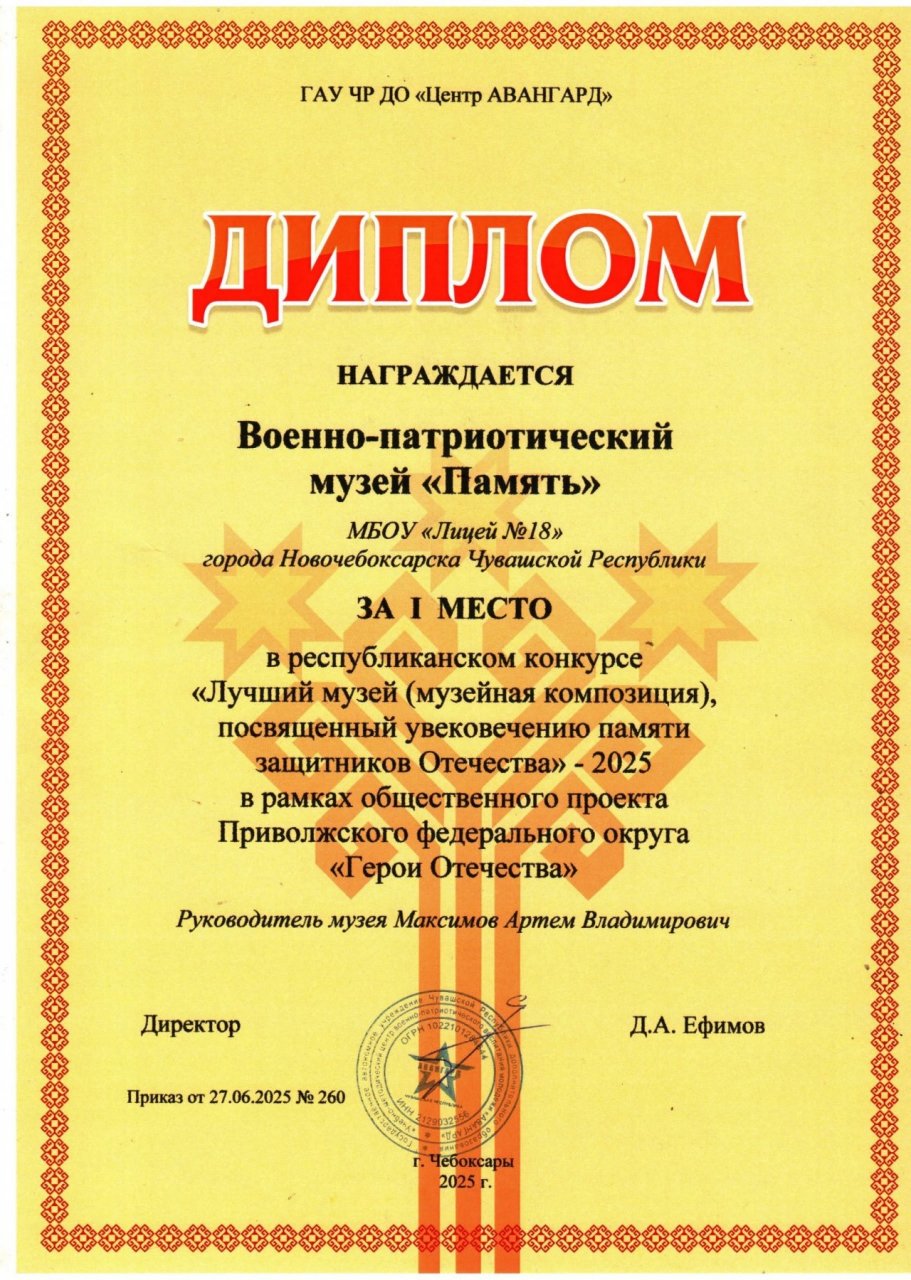 Лицейским музеем боевой славы руководит победитель республиканского этапа профессионального конкурса "Учитель года - 2024" и участник от Чувашии федерального этапа этого престижного конкурса учитель истории и обществознания лицея № 18 Артем Максимов.