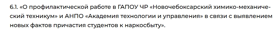 Как сообщается на официальном сайте одним из важных вопросов стала тема профилактической работы в Новочебоксарском химико-механическом техникуме и Академиии технологии и управления. Как уточняется в повестке заседания: "В связи с выявлением новых фактов причастия студентов к наркосбыту".