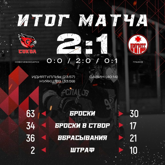 Первый гол 2025/26 оформил нападающий Роберт Идиятуллин (18) после передачи Ильдара Арсланова (9) – это его дебютный гол в молодежной лиге. Следом счет удвоил Илья Нуякшев (52), поразив ворота с паса Антона Битева (68). Игровое преимущество оставалось за “Соколом”: матч закончился со счетом 2:1. В команде “Прогресс” из Глазова отличился хоккеист Савин.