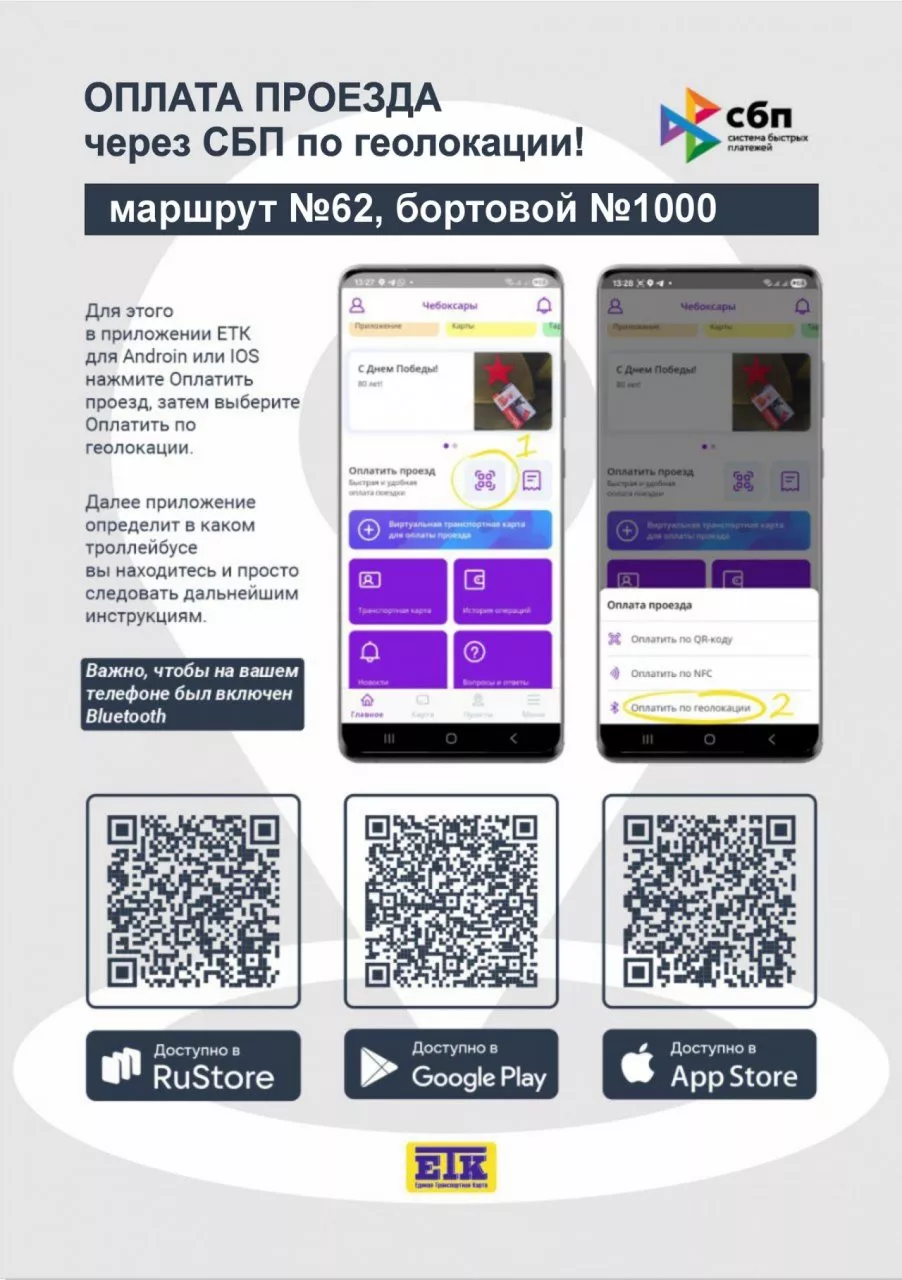 Для пассажиров, регулярно перемещающихся по маршруту № 62, который связывает города Чебоксары и Новочебоксарск, внедрена система оплаты проезда, основанная на технологии геолокации. Первым транспортным средством, где пассажиры могут протестировать данную технологию, стал троллейбус с бортовым номером 1000.