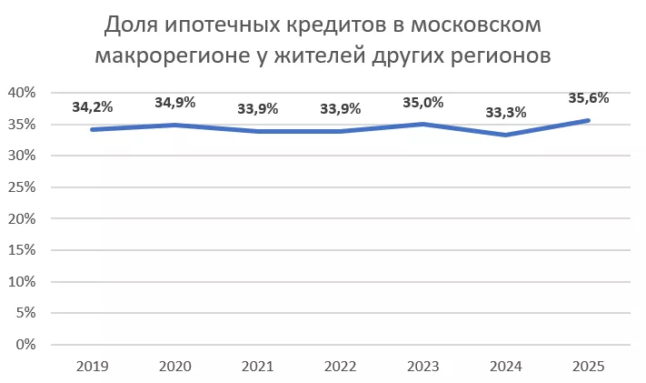 В 2025 году 35,6% ипотечных кредитов в Московском макрорегионе взяли жители других регионов. Вопреки распространенным в СМИ оценкам эта цифра достаточно стабильна.