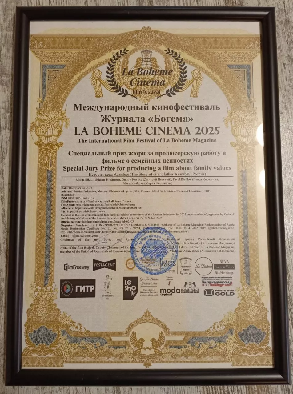 На Международном кинофестивале "La Boheme Cinema 2025" в Москве фильм Марата Никитина "История деда Азамбая" получил специальный приз жюри за продюсерскую работу в фильме о семейных ценностях.