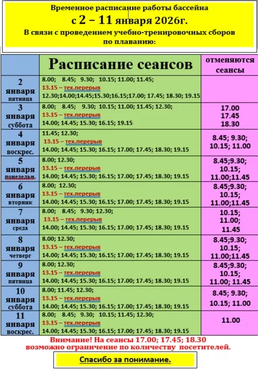 В спорткомплексе бассейн начнет работать со 2 января. Первый сеанс - в 8:00. Тренажерный зал откроет свои двери лишь 5 января.