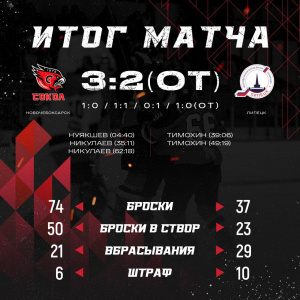 В овертайме игровое преимущество осталось за "Соколом": липецкой команде не удалось нанести ни одного броска по воротам хозяев за дополнительное время. Победную шайбу и второй гол в матче оформил защитник Даниил Никулаев, замкнув передачу Андрея Жаровцева (28) и Ильи Нуякшева (52) и установив окончательный счет 3:2.