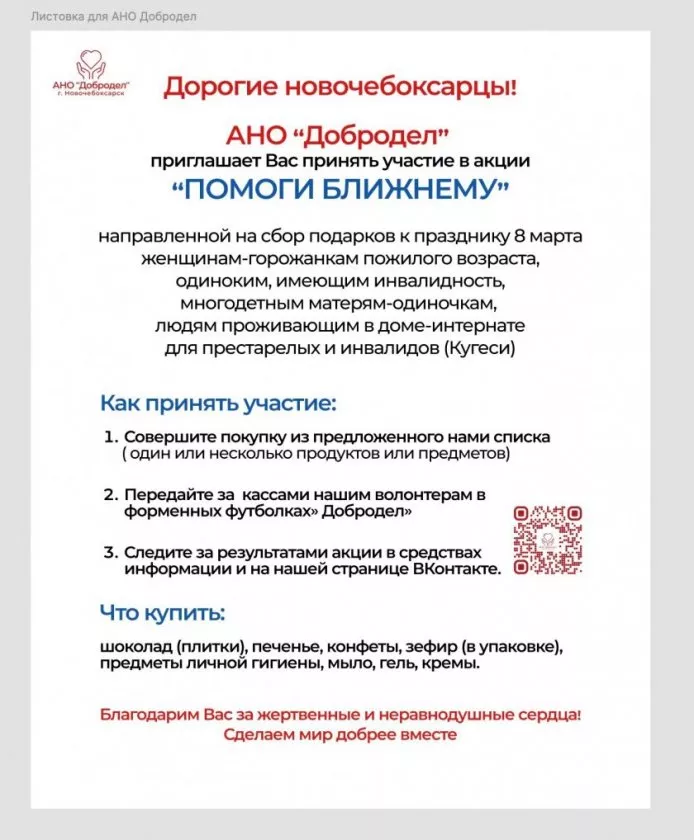 24 февраля прошел первый день благотворительного мероприятия. АНО "Добродел" из Новочебоксарска собирает подарки к 8 Марта для пожилых горожанок, одиноких женщин с инвалидностью, многодетных матерей-одиночек, а также для женщин, проживающих в доме-интернате для престарелых и инвалидов в поселке Кугеси.