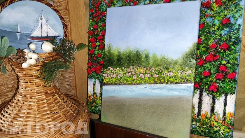 "В жизни у меня случилась "зима". Видимо, поэтому захотелось чего-то светлого, яркого, весеннего. И у меня появились картины, на которых "Моя весна" - много желтого, зеленого, голубого неба", — говорит она с улыбкой.