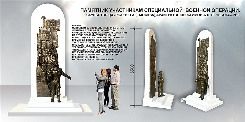 Третий и четвертый варианты, разработанные О.А. Цхурбаевым и А.Л. Ибрагимовым, предусматривают стелу из белого бетона с рельефом воинов разных эпох, переходящим в фигуру современного героя СВО, а также монументальную композицию на «Аллее славы» с бронзовыми фигурами защитников Отечества от древних времен до участников специальной военной операции на каменном постаменте.