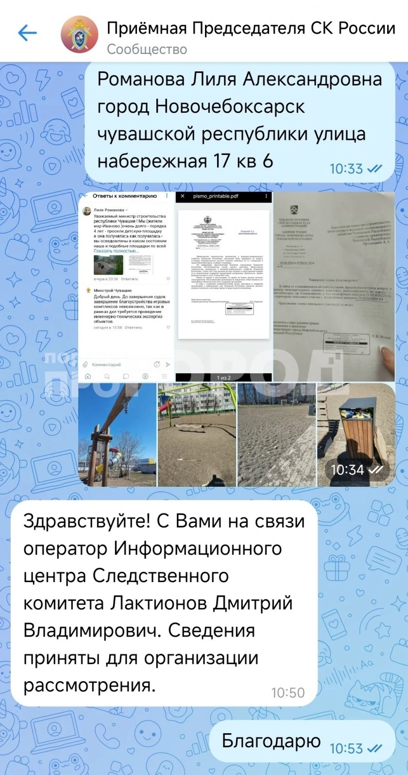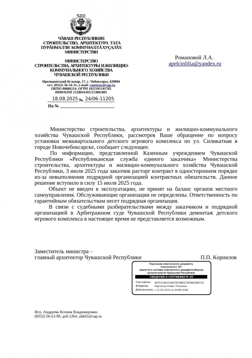 "Мы, жители микрорайона Иваново города Новочебоксарска, обращаемся к Вам с просьбой взять под личный контроль ситуацию, связанную с недостроенной межквартальной детской площадкой, расположенной возле МБОУ "СОШ №11" и во дворе дома по адресу Заводская, 11. На благоустройство данной территории были выделены бюджетные средства. Несмотря на это, работы не были выполнены в полном объеме. В настоящее время существует угроза демонтажа единственной в микрорайоне детской площадки, что приведет к ущемлению прав и законных интересов наших детей и внуков, лишенных возможности безопасного и комфортного досуга.