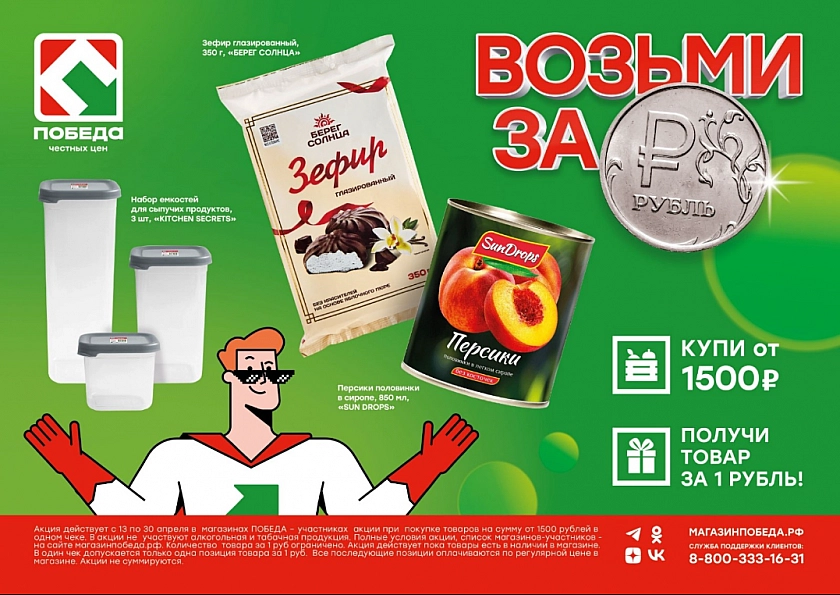 Планируете покупки, но хотите сэкономить? Участвуйте в новой акции от сети магазинов ПОБЕДА “Возьми за рубль”. Только с 13 по 30 апреля покупай в выделенных магазинах ПОБЕДА и добавляй в чек один акционный товар всего за 1 рубль.