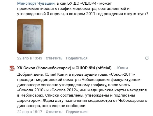 Администрация СШОР № 4 Новочебоксарска дала ответ маме одного из игроков "Сокол - 2011". Медосмотр ребят стоит в плане медосмотров Чебоксарского физкультурного диспансера. Комментарий разместил администратор официальной страницы ХК "Сокол" и СШОР № 4 Новочебоксарска.