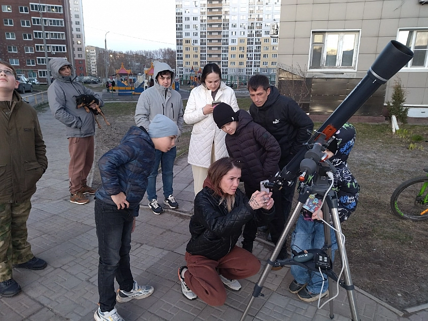 С шести до восьми вечера у прибора не было отбоя от посетителей. Первыми прибежали дети с соседней детской площадки — их набралось около десятка. Следом подошли родители и случайные прохожие. Астроном показал им заходящее Солнце с солнечными пятнами, Луну, Юпитер и Венеру — с увеличением до 90 крат.